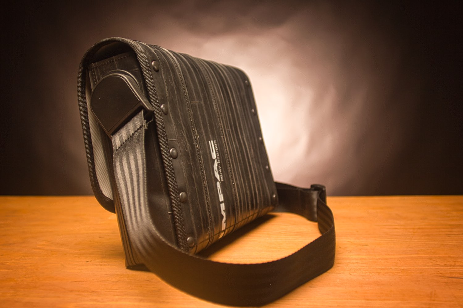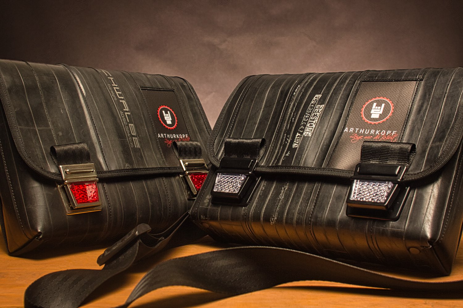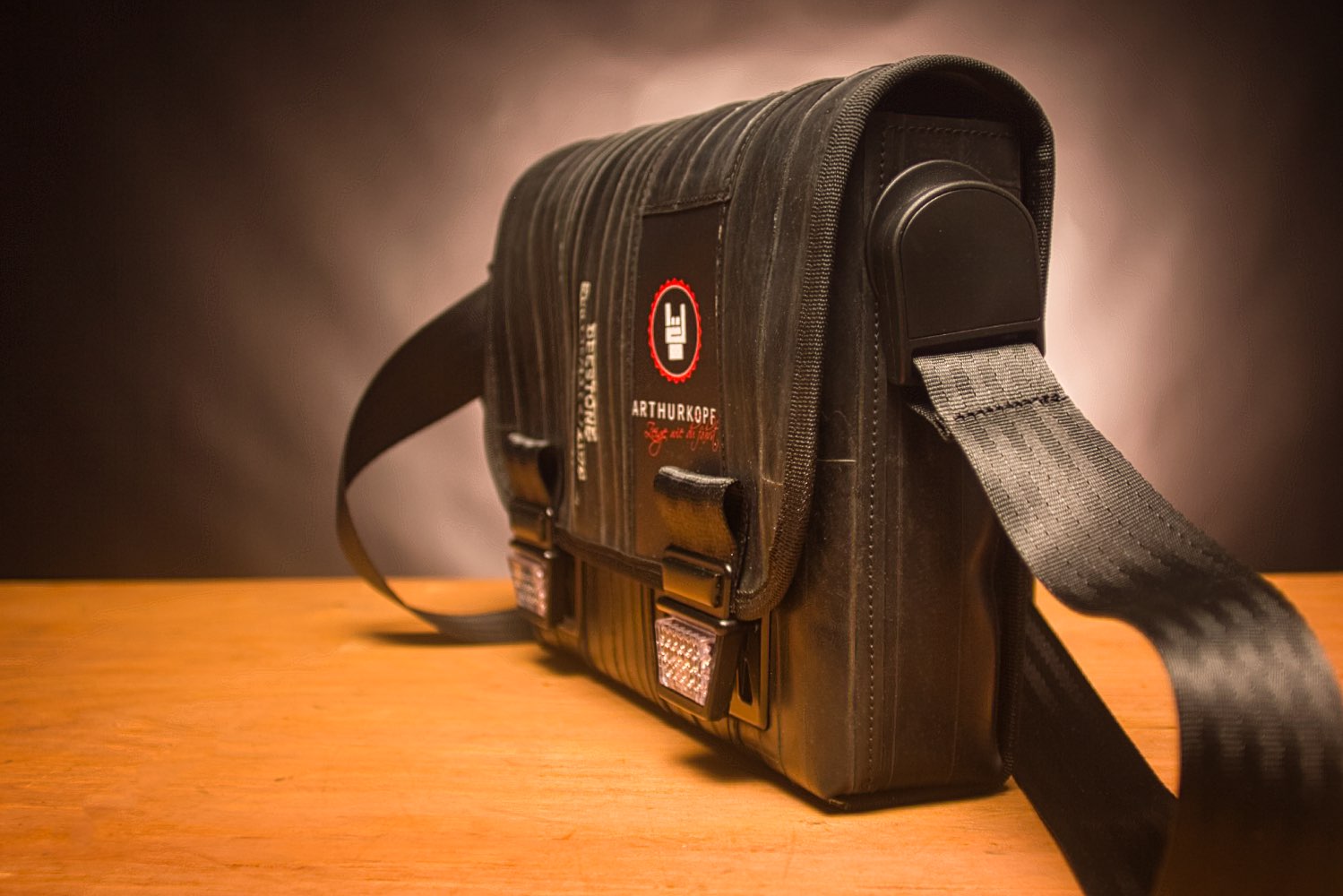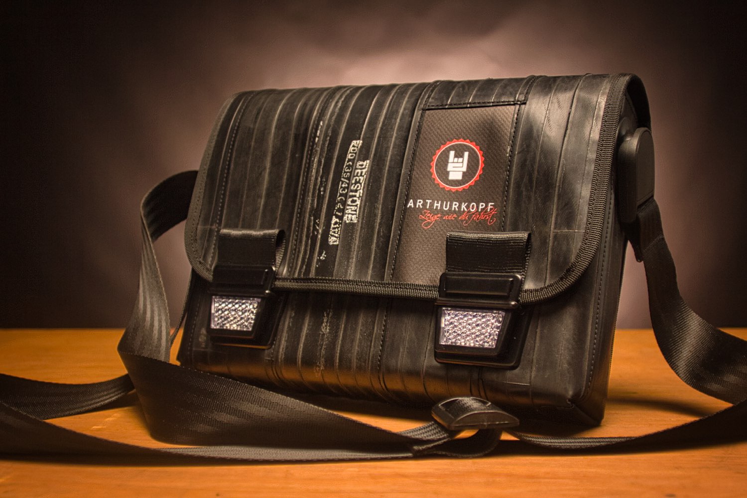 Tasche 6.1 mini zeigt sich äußerlich komplett aus Fahrradschlauch. Die Typografie der Schlauchhersteller und/oder aufgearbeitete Flicken, die vom vergangenen Leben der Fahrradschläuche berichten, machen jedes Exemplar zu etwas Einzigartigem. Innen könnt ihr farbliche Akzente durch die eingearbeitete Plane setzen. Die Aktentasche aus Fahrradschlauch ist relativ leicht und angenehm zu tragen. Bei dieser Tasche ist der Ansatz von klarem, zeitlosem Design ohne überflüssige Elemente deutlich spürbar. Unser eigens von Hand angefertigtes Sandwichmaterial eignet sich für diese Tasche besonders gut. Der Schlauch und die Plane kontrastieren sich perfekt und jedes Material profitiert von den Eigenschaften des anderen. Ein kleines Steckfach bietet Platz z.b. für euer Telefon. Der Umhängegurt ist stufenlos verstellbar. Die Fixierung des Trageriemens an der Taschenseite ermöglicht ein kippfreies Tragen der Tasche; sie liegt eng am Körper ohne zu baumeln. Das Hauptfach mit verstärktem Boden ist nicht unterteilt. Somit ist ausreichend Platz für Unterlagen oder Zeitschriften im Format DIN A-5. Die Schließe an der Tasche 6.1 erinnert an alte Schulranzen und erzeugt ein gutes Gefühl an eine vergangene Zeit. Beim Verschließen machen sie ein bestätigendes „Klack“ Geräusch, welches einem eindeutig klarmacht, das diese Tasche verschlossen ist. So verbinden wir die positiven Emotionen und die nach vorn gerichtete klassisch klare Reduziertheit ausgezeichnet. Kurz gesagt ist es ein Prachtstück von Tasche aus dem Hause ARTHURKOPF. Mit diesem Teil kann man deutlich seine Affinität zum Radfahren und auch zum Besonderen nach außen tragen. Hier greift ganz deutlich unser Motto: